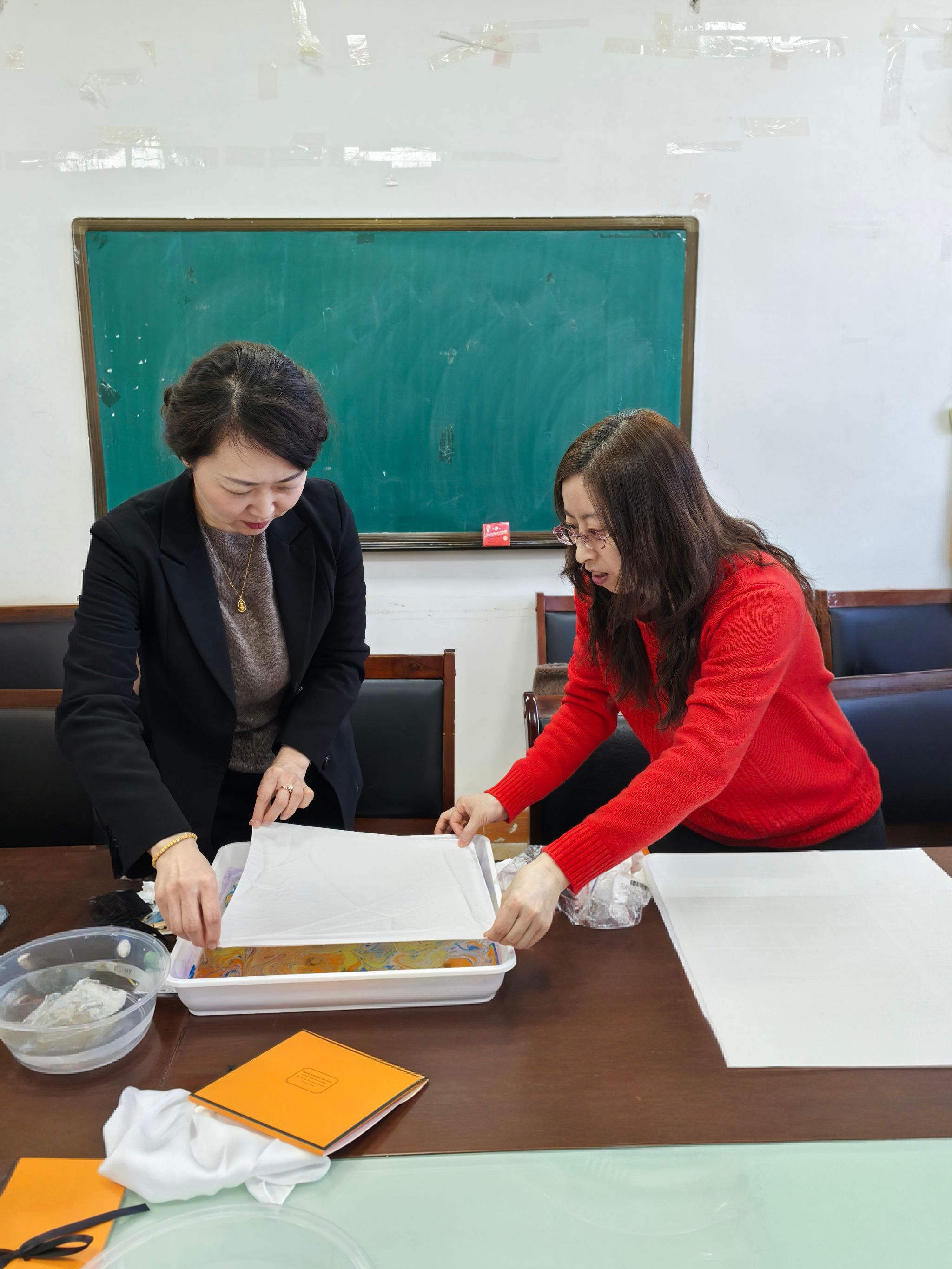 活动伊始,学院妇委会主任毛艳向全体女教职工致以节日的诚挚问候和美好祝福,对她们在教学、科研、管理等岗位上为学院发展所付出的辛勤努力和积极贡献表示衷心的感谢。随后,毛艳为大家详细讲解了水拓画的历史渊源、艺术特点以及制作原理。水拓画,又称湿拓画,是一种源自古代中国的古老绘画技艺,利用油水不相混溶的原理,让颜料在水面自然流动、交融,形成千变万化的图案,再将丝巾轻覆水面,将瞬间的流动之美永恒定格于织物之上,被誉为“水中绽放的花朵”。
